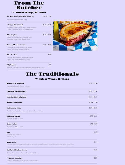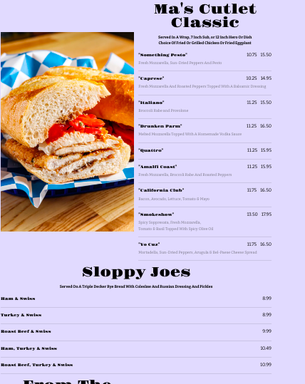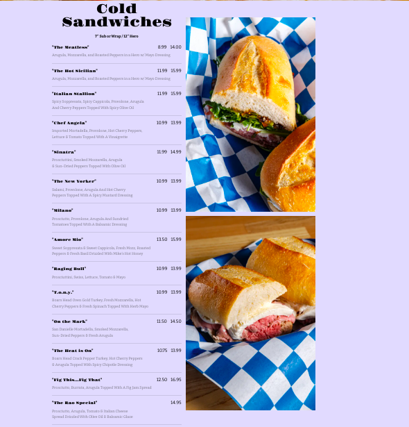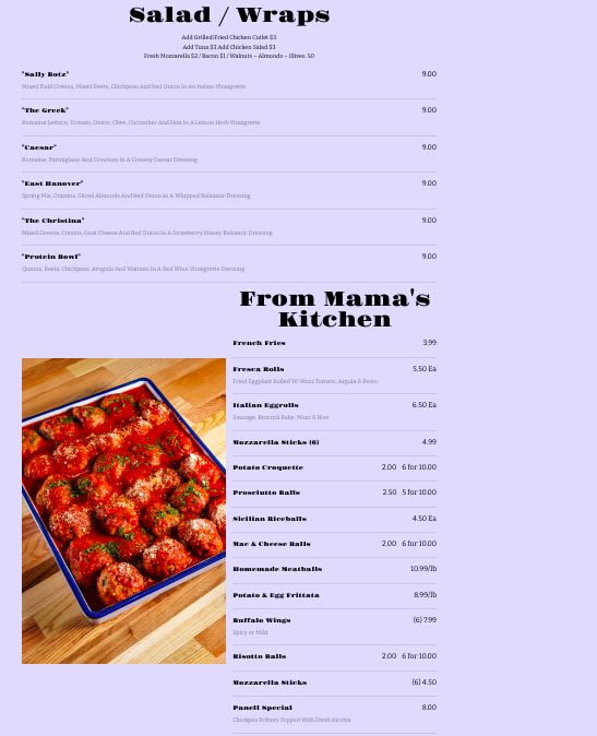 The menu at Mama Rao's Kitchen offers a thoughtful mix of comforting sandwiches, hearty soups, and fresh salads, all inspired by classic Italian deli traditions with some unique touches. Whether you're stopping by for a casual lunch, picking up a satisfying sandwich like the Chicken Parm or Caprese, or browsing their market for speciality items, the selection feels approachable and familiar.